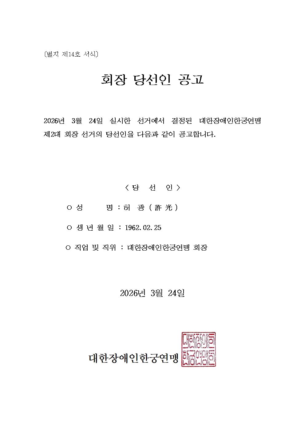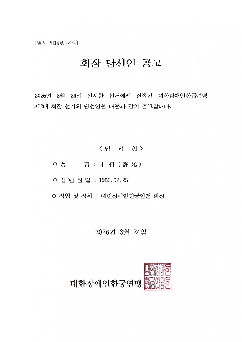 대한장애인한궁연맹 제 2대 회장 당선인 공고문