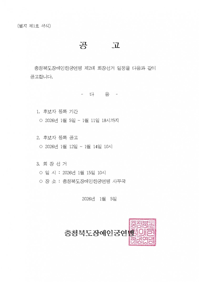 충청북도장애인한궁연맹 제2대 회장선거 공고문 안내