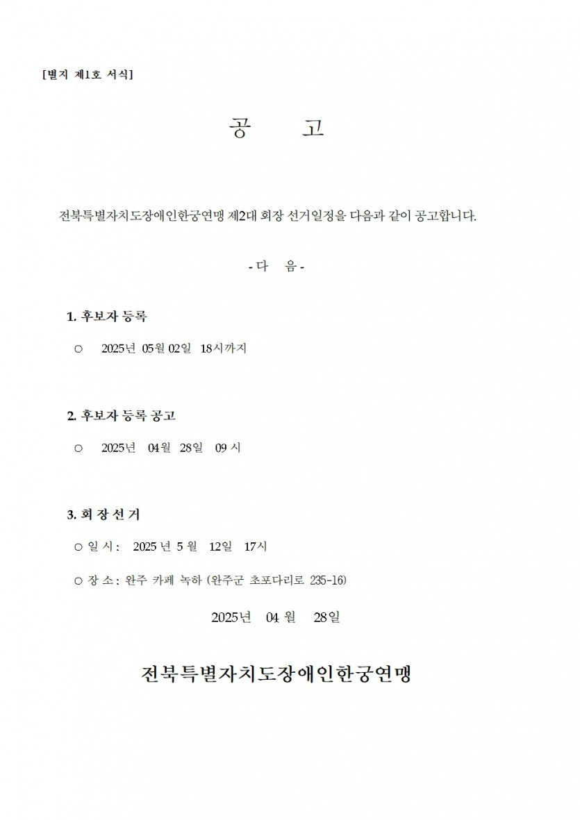 전북특별자치도장애인한궁연맹 제2대 회장 선거일정을 다음과 같이 공고합니다.