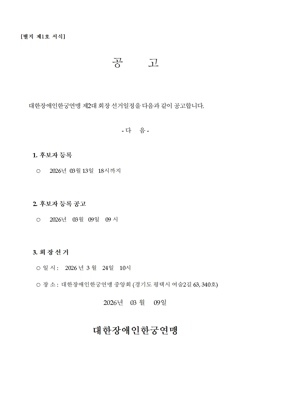 대한장애인한궁연맹 회장 선거 공고 안내문